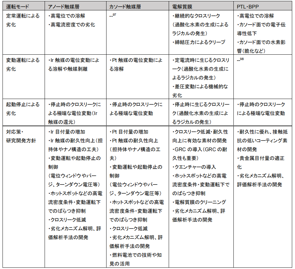 表1.5.3-2 提高水电解系统性能、耐久性的前提条件(PEMWE)